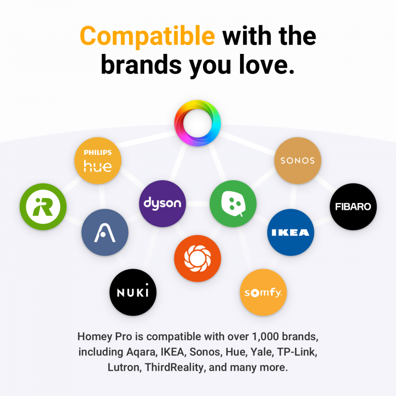 Homey Pro peut piloter l'éclairage, les capteurs, les serrures, les thermostats, les caméras ou encore les systèmes audio grâce à ses nombreuses intégrations officielles.