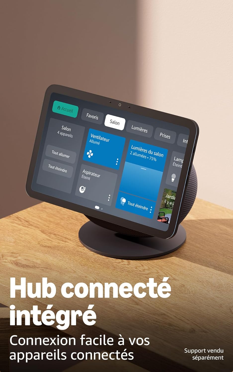 Polyvalent, il s’intègre aussi bien dans une chambre que dans une pièce de vie. Son interface simple facilite la création d’un scénario intelligent, comme afficher automatiquement la caméra de la porte d’entrée lorsqu’une sonnette compatible détecte un visiteur, ou diffuser une ambiance sonore en soirée.
